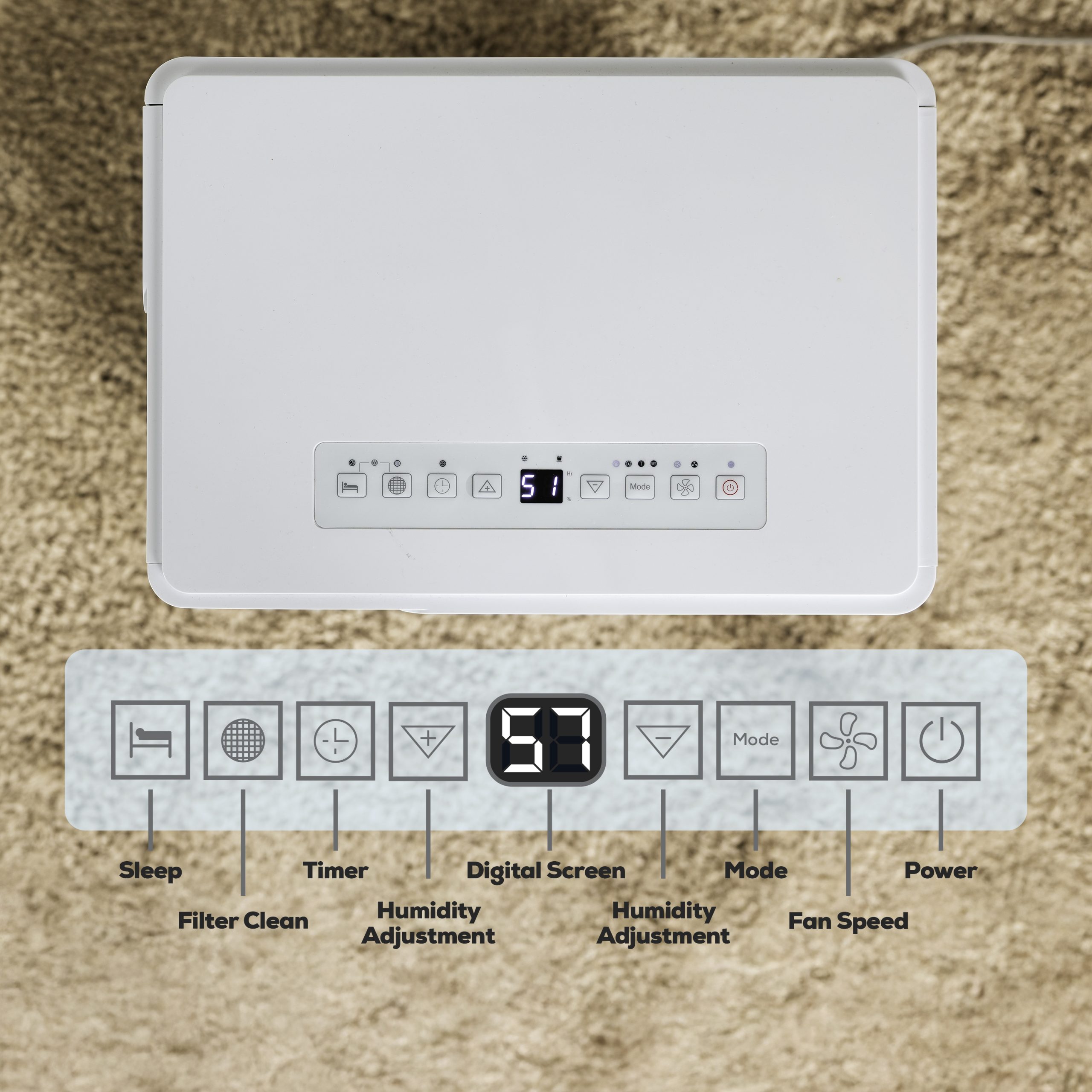 - TIMER FUNCTION – Lets you program specific run times with auto stop when run time is finished. Helps to save energy by operating only when you need moisture control.